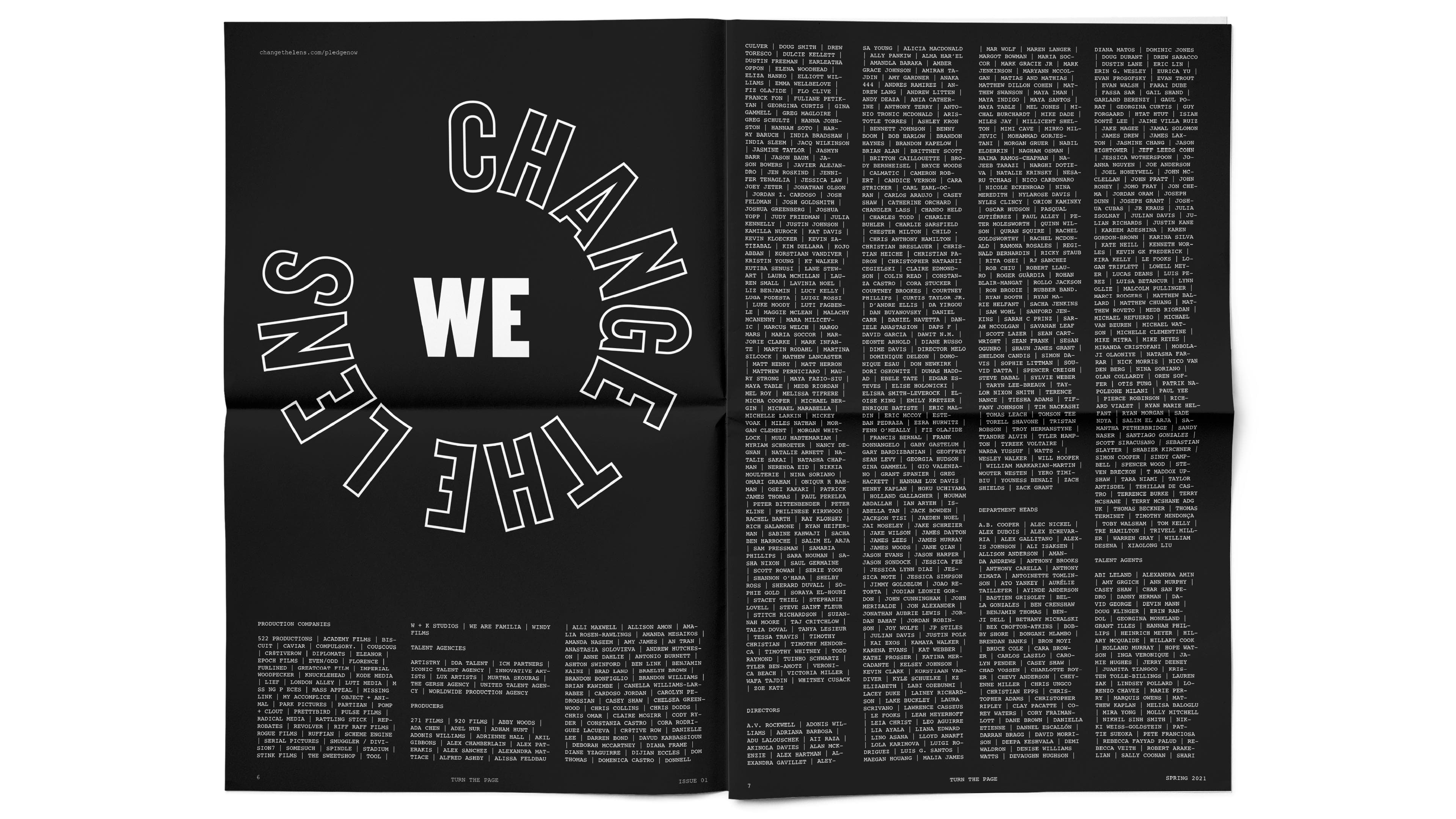 Brand identity and campaign visuals for Change the Lens, a non-profit founded by 100 internationally recognized filmmakers. Approximately 15% of the population in leading global film hubs is Black. Change the Lens is a pledge to ensure that the representation of Black filmmakers within the commercial and music-video film industry reflects this demographic. The logo draws inspiration from protest signs of the 1968 Memphis Sanitation Workers’ Strike.