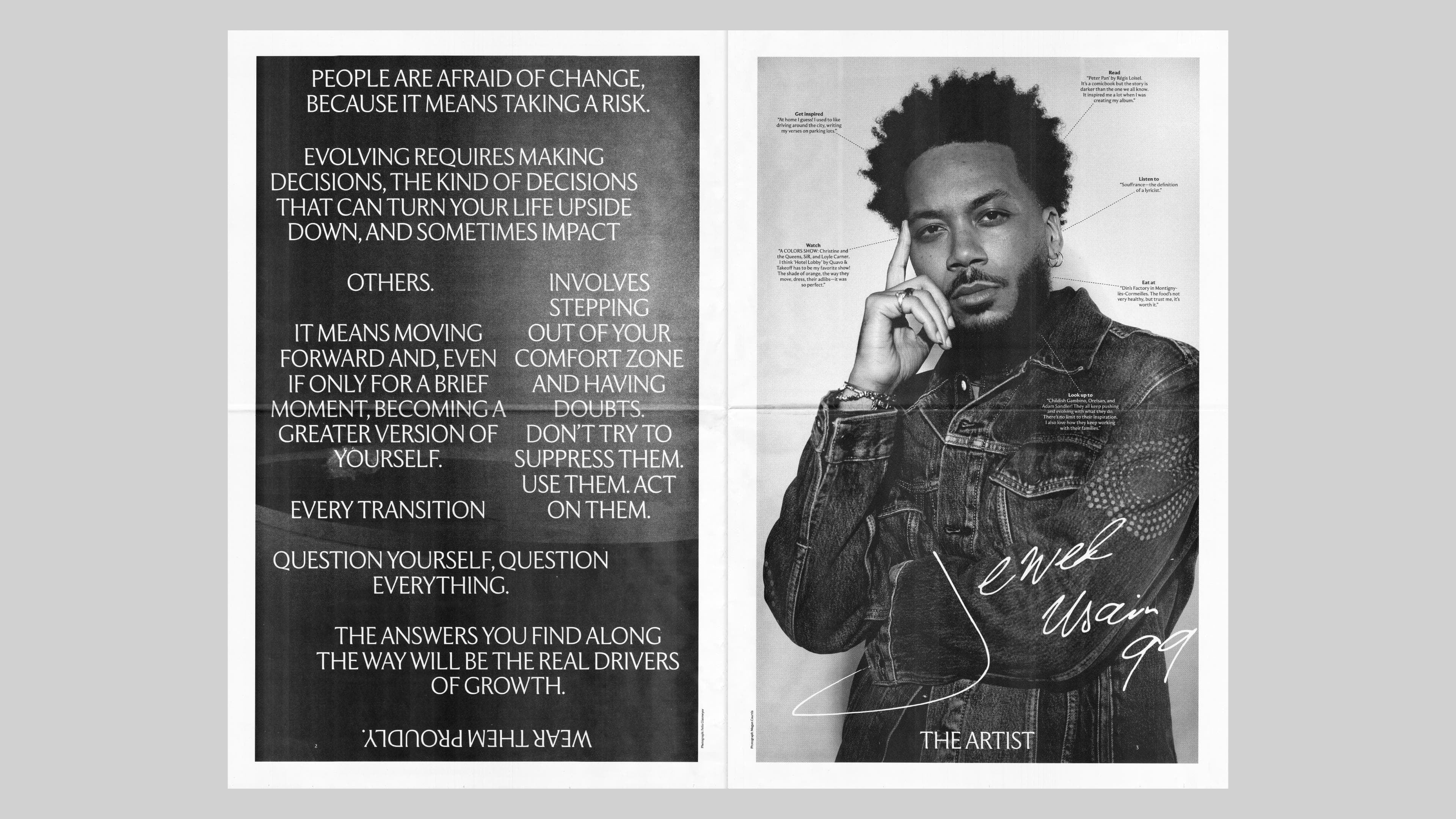 Campaign lookbook created as part of Levi’s brand collaboration and limited-edition product capsule with COLORSxSTUDIOS. The publication, which included an exclusive interview with French rapper Jewel Usain, received a Merit Award from the Society of Publication Designers and is featured in the Type Directors Club Tokyo Annual 2025.